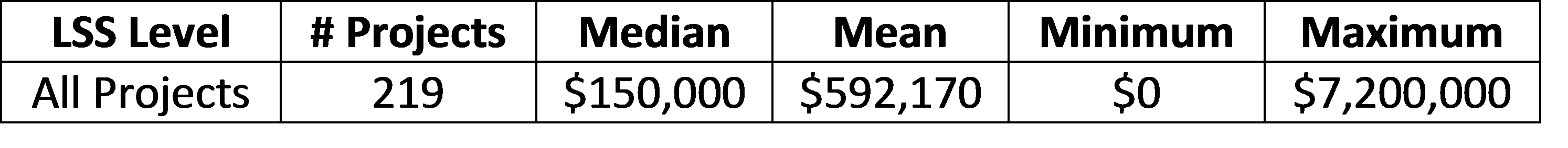 Finally, I will note that the mean reported financial payback is quite an astonishing figure, at the tune of over half a million dollars per improvement project.  Clearly some LSS projects do result in a huge payback. We hope that by sharing this information it will be easier for you to convince upper management that LSS can have a tremendous financial impact on your company’s bottom line. To see the complete results from my analysis of the 219 projects we reviewed please click here for the presentation.